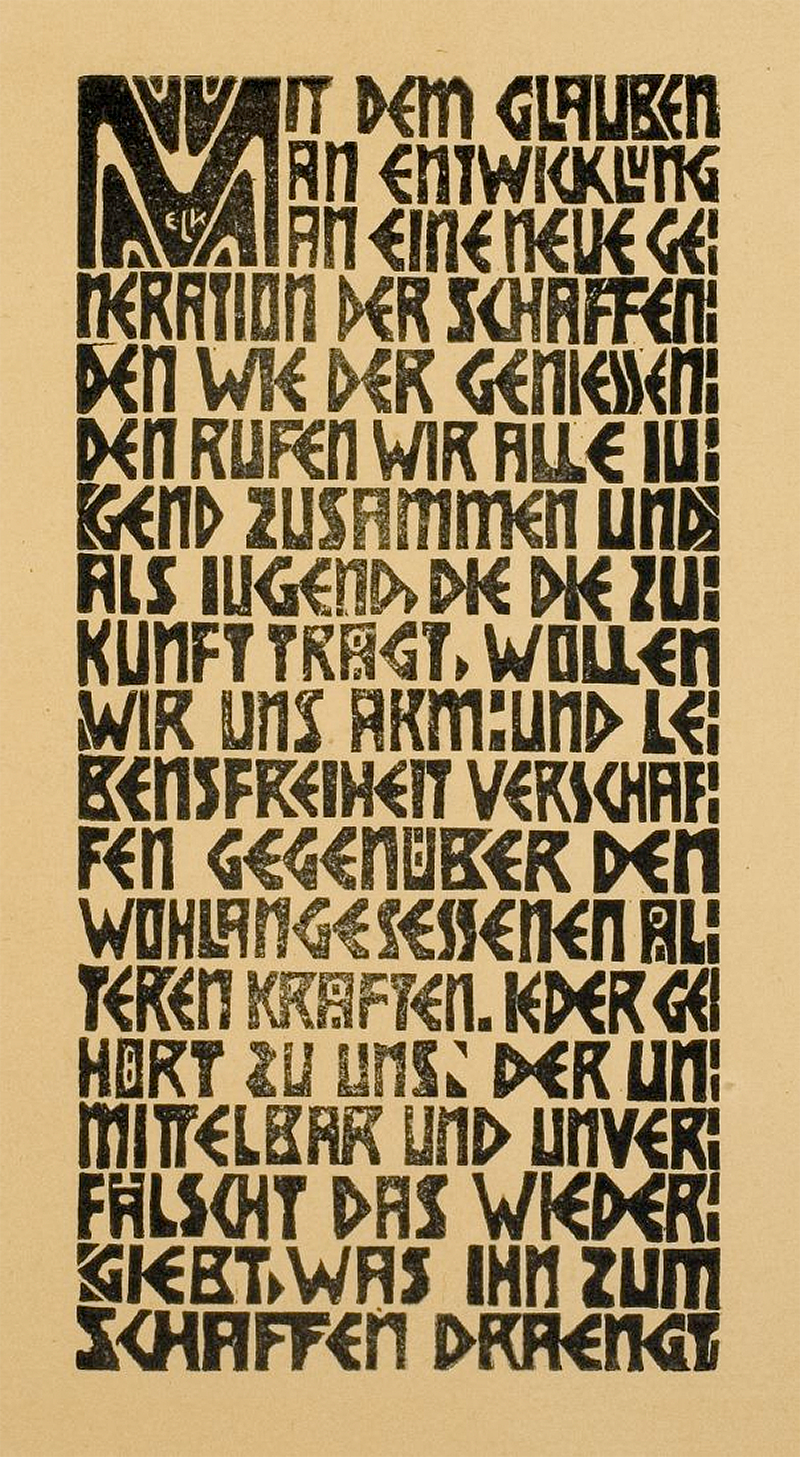 William Morris (1834–1896), einer der Gründer der „Arts and Crafts” Bewegung, sowie die meisten Kritiker und Typografen seiner Zeit waren sich einig, dass der Stil des Historismus den Verfall der Qualität bedeutet. Es sind in dieser Zeit jene Begriffe wie „Lesbarkeit der Schrift” oder „Geschlossenheit der Buchseite” wieder erfolgreich in die Praxis umgesetzt worden. Die Typografie orientiert sich wieder an den Vorbildern der Renaissance: die Golden Type der Kelmscott Press (1891) geht auf Nicolas Jenson zurück. Nicht nur das Schriftbild, sondern auch andere Elemente wie Ornamentik, Linie, Initialen, Illustration, Papier, Druck und Bindung werden bei der Produktion eines Druckwerkes berücksichtigt und abgestimmt. Das ausgehende XIX. Jahrhundert ist durch den Jugendstil gekennzeichnet. Geprägt ist diese Zeit durch die Sehnsucht nach Schönheit und Individualität, die abstrahierenden Formen finden ihre Vorbilder häufig in der Natur. Es wurden ganze Alphabete neu entworfen, die dem kompositorischen Ganzen untergeordnet worden sind. Die populärsten Medien für Druckbotschaften waren Zeitschrift und Plakat, die den Formenreichtum der Epoche oft prunkvoll darstellten. |