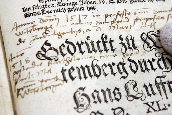 jahrhundertelang treu. Teilweise wird dieser Zustand durch die Reformationsbewegung (1517 Luther in Wittenberg, dann Melanchthon, Zwingli, Bucer, Calvin, Anglikaner), den Druck von Propagandaschriften 30, sowie durch die Verwendung der Landessprache in der Liturgie und in den Übersetzungen der Bibel in diese Sprachen, begünstigt. Die Antiqua wird als die Hausschrift des Erzfeindes – der katholischen Kirche – gesehen. Die Fraktur wird in den deutschsprachigen Ländern bis zum Ende des II. Weltkriegs vorwiegend als Gebrauchsschrift genutzt, die Antiqua dient lediglich den Auszeichnungszwecken. |